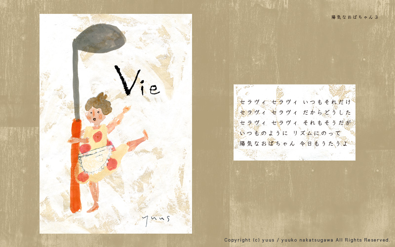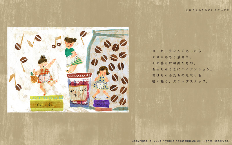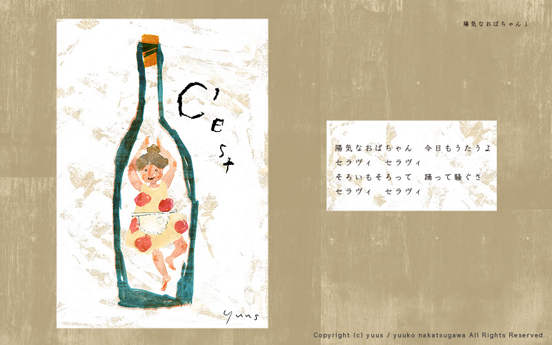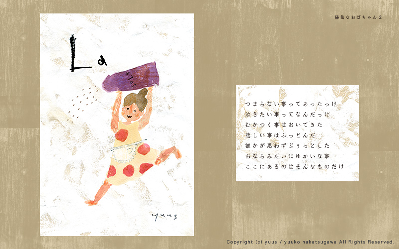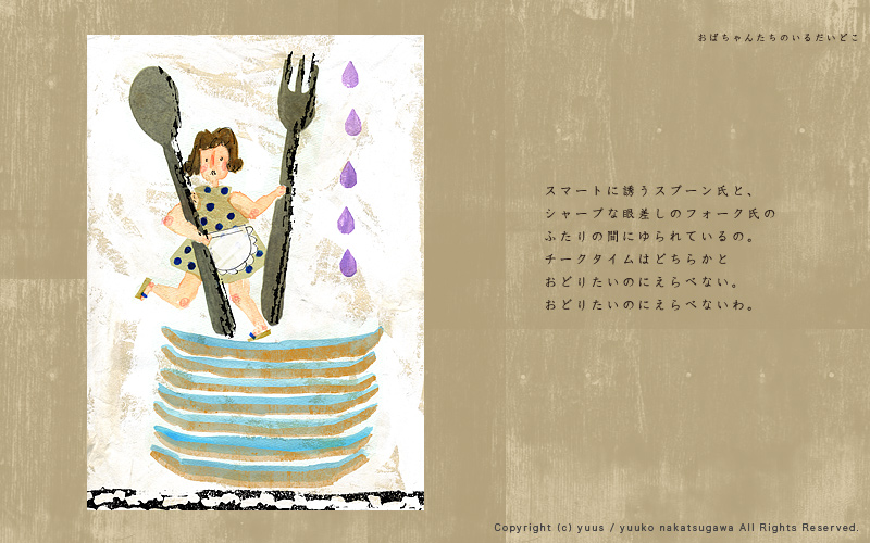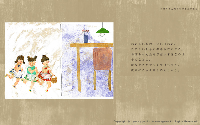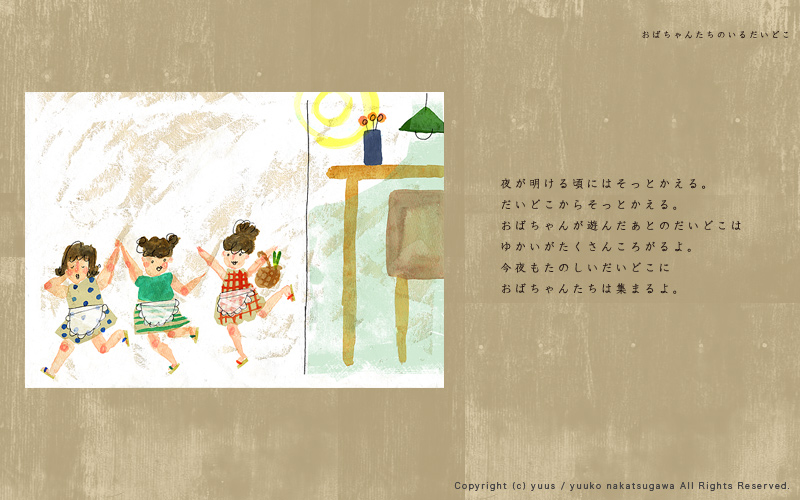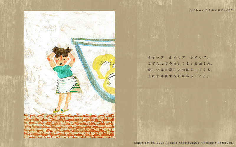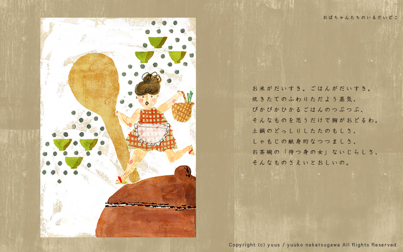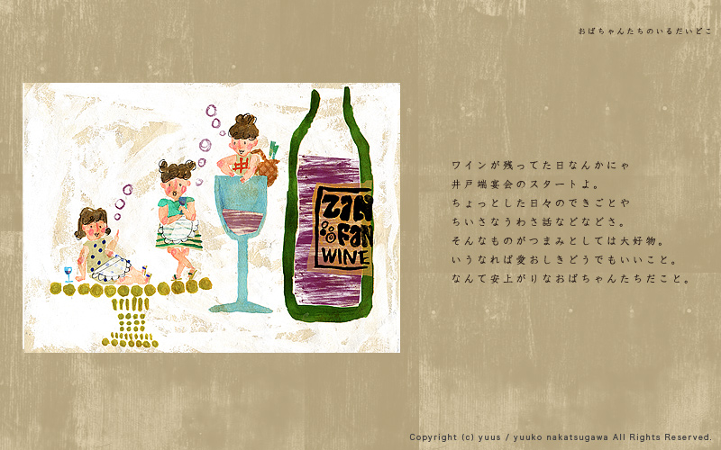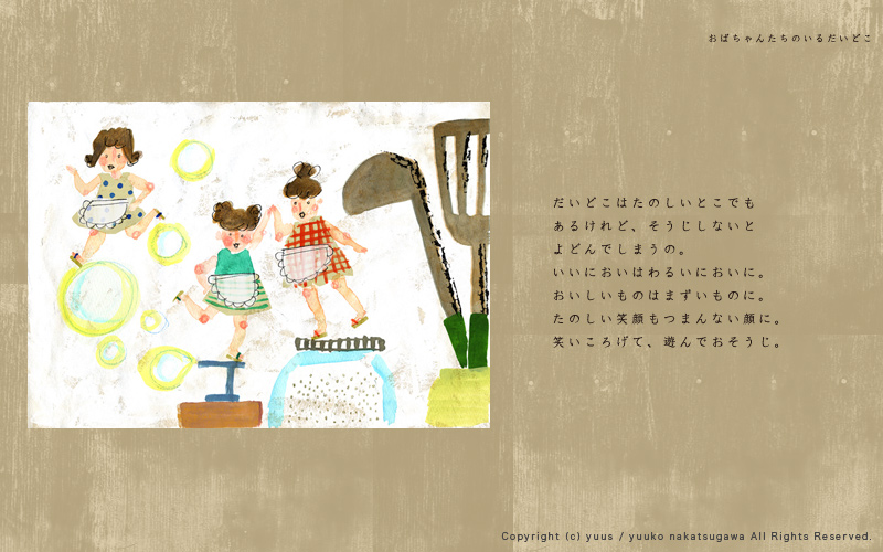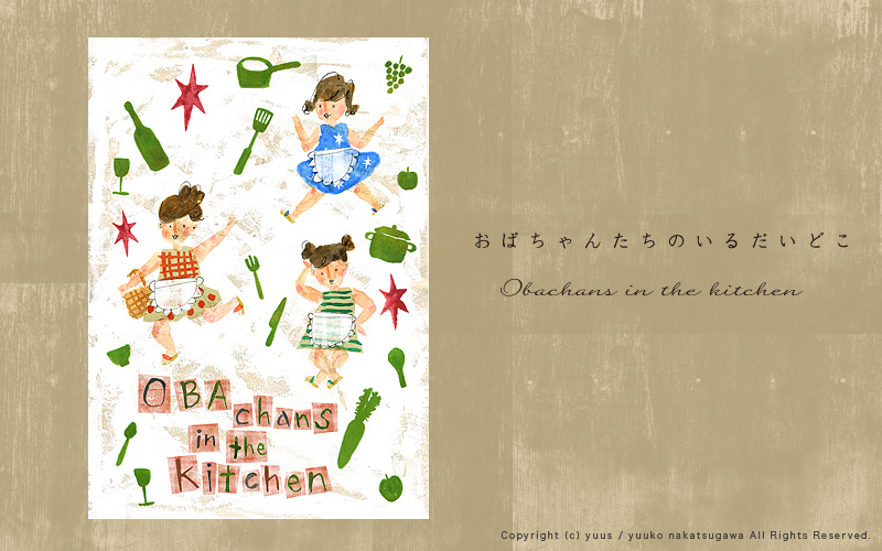 HOME Gallery Top Gallery「Obachan」 Yuuko Nakakatsugawa Illustration Gallery 「おばちゃんたちのいるだいどこ」 こちらの作風を元としたお仕事のご依頼やご相談など、 どうぞお気軽にご連絡ください。 ※手元に作品がある場合、こちらの作品(原画もしくはプリント作品)の購入も可能です。 Gallery「Birds and Flowers」 Gallery・TOP Gallery「Ojisan」